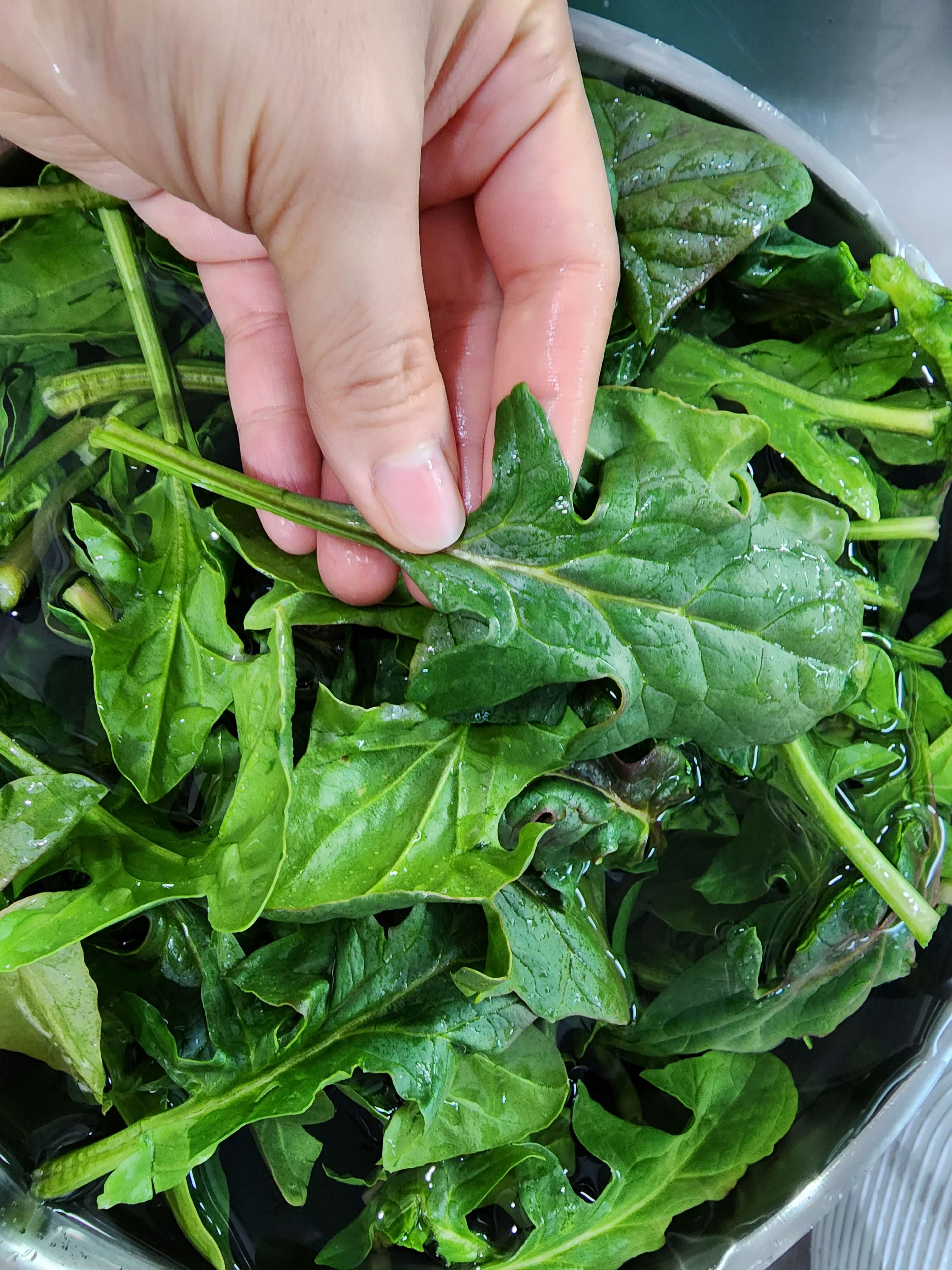 시금치를 흐르는 물에 다시 씻어줍니다.